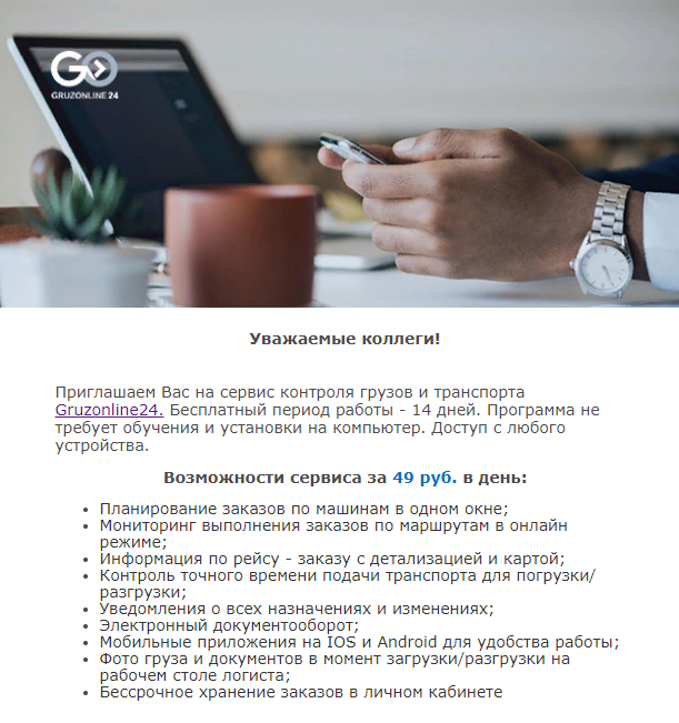 Приглашаем Вас на сервис контроля грузов и транспорта Gruzonline24 Бесплатный период работы - 14 дней. Программа не требует обучения и установки на компьютер. Доступ с любого устройства.